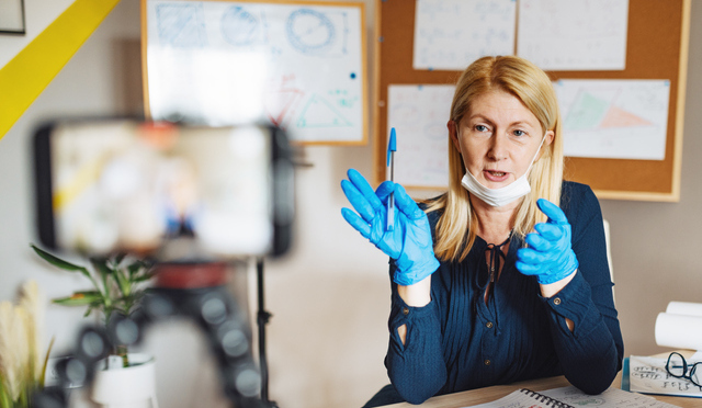 Professor with face mask and protective gloves during online classroom for pupils in quarantine